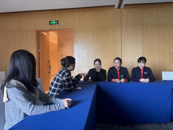 图为学院教师同武汉马哥孛罗酒店实习学生交谈