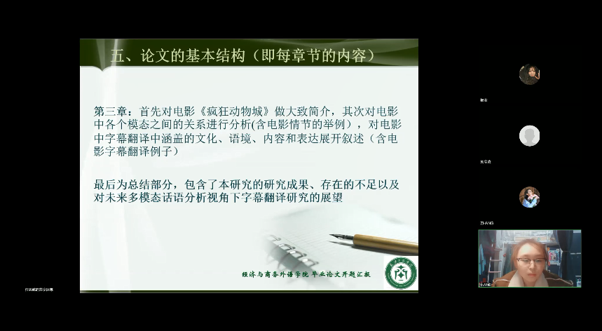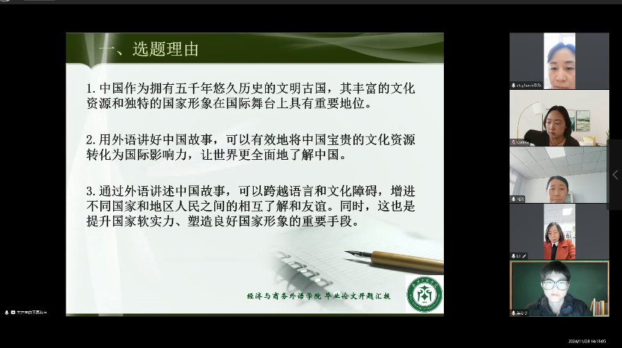 经济与商务外语学院新闻中心讯(记者:田佳慧)经济与商务外语学院英语专业于2024年11月28日举行线上开题汇报。英语专业156名学生共分为10个小组,采用腾讯会议线上汇报的形式。学生将开题报告表内容通用ppt汇报的形式,进行陈述,指导小组教师对学生的开题报告进行提问,提出修改意见和建议。