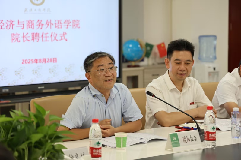 刘春校助随后发言,对欧阳红兵院长的任职表示热烈欢迎与祝贺,同时高度肯定前任院长张晓骏在任期间的工作成效——其带领学院成功打造“世界技能大赛国家集训基地”(物流与货运代理方向)、“中部金融讲坛系列”(已举办60余期)两大特色品牌。针对学院未来发展,刘春校助提出两点期望:一是助力2026届本科毕业生达成学位英语要求、强化考研英语辅导工作;二是推动学科交叉融合,依托学院“经济+外语”的特色优势,探索更多创新发展路径。