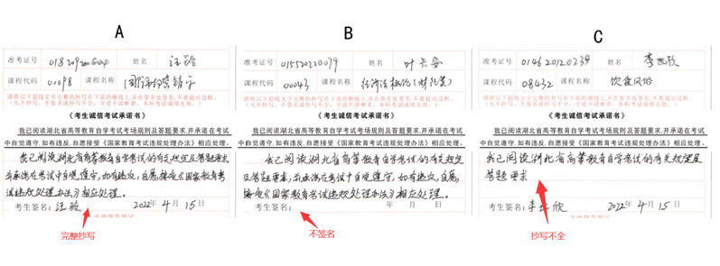 6、考生应主动配合课程笔迹信息采集,在答题卡指定区域按规定完整抄写《考生诚信考试承诺书》,不抄写、不签名或抄写不全,字迹不清晰者,该科考试成绩无效。毕业时省教育考试院将对每张答题卡上的《考生诚信考试承诺书》笔迹进行复核,凡笔迹不一致,经鉴定为代考的,将根据《国家教育考试违规处理办法》作出成绩作废、延迟毕业、记入国家教育考试诚信档案等处理。