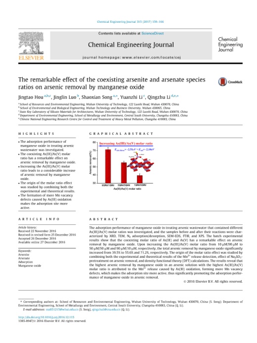 The Remarkable Effect of the Coexisting Arsenite and Arsenate Species Ratios on Arsenic Removal by Manganese Oxide
