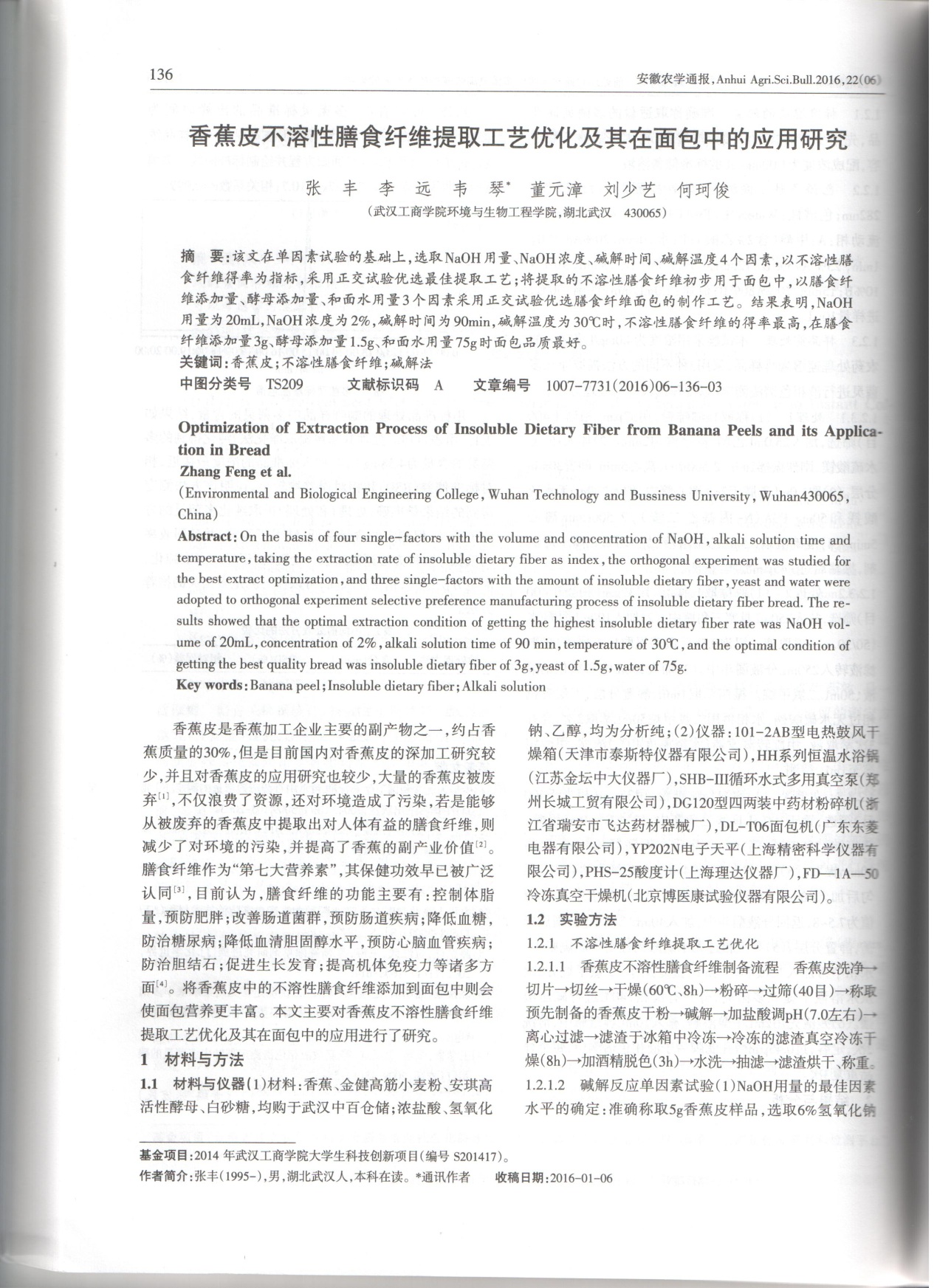 香蕉皮不溶性膳食纤维提取工艺优化及其在面包中的应用研究