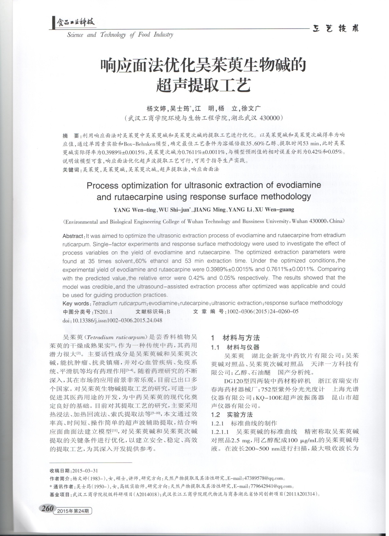 响应面法优化超声波提取吴茱萸生物碱的工艺研究