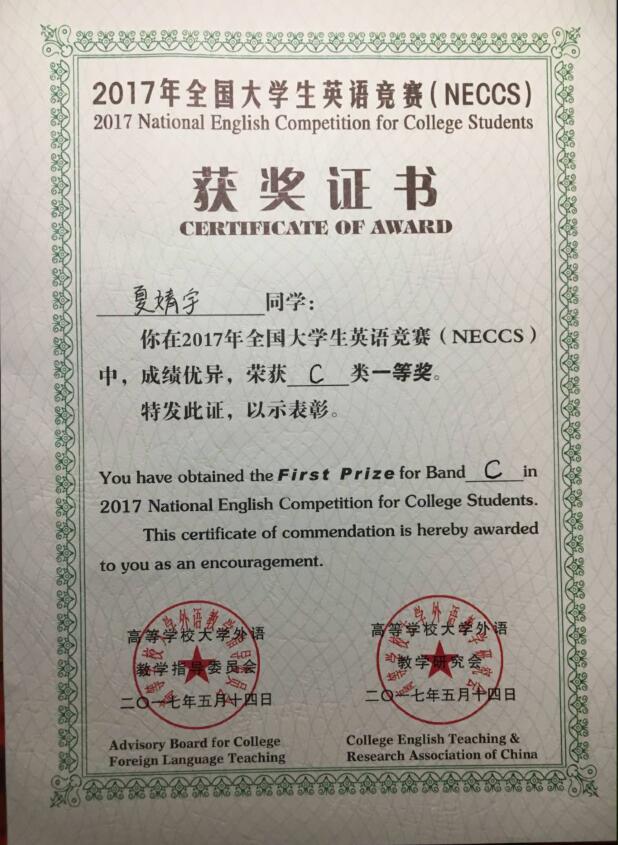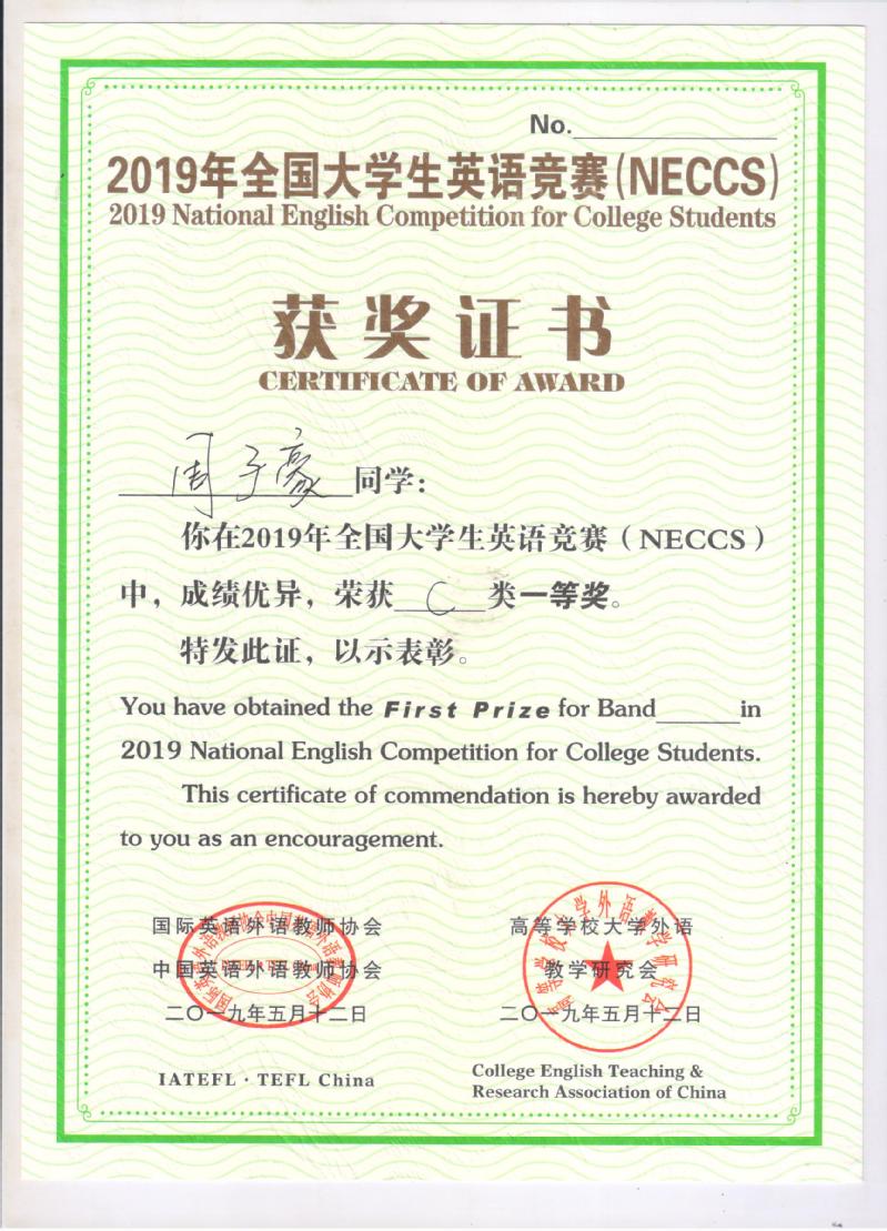 全国大学生英语竞赛(NECCS)是经国家教育部批准,旨在落实大学英语教学改革精神,激发广大大学生学习英语的兴趣,促进大学生英语水平的全面提高。下图分别为我校学生近三年(2017-2019年)获得一等奖证书: