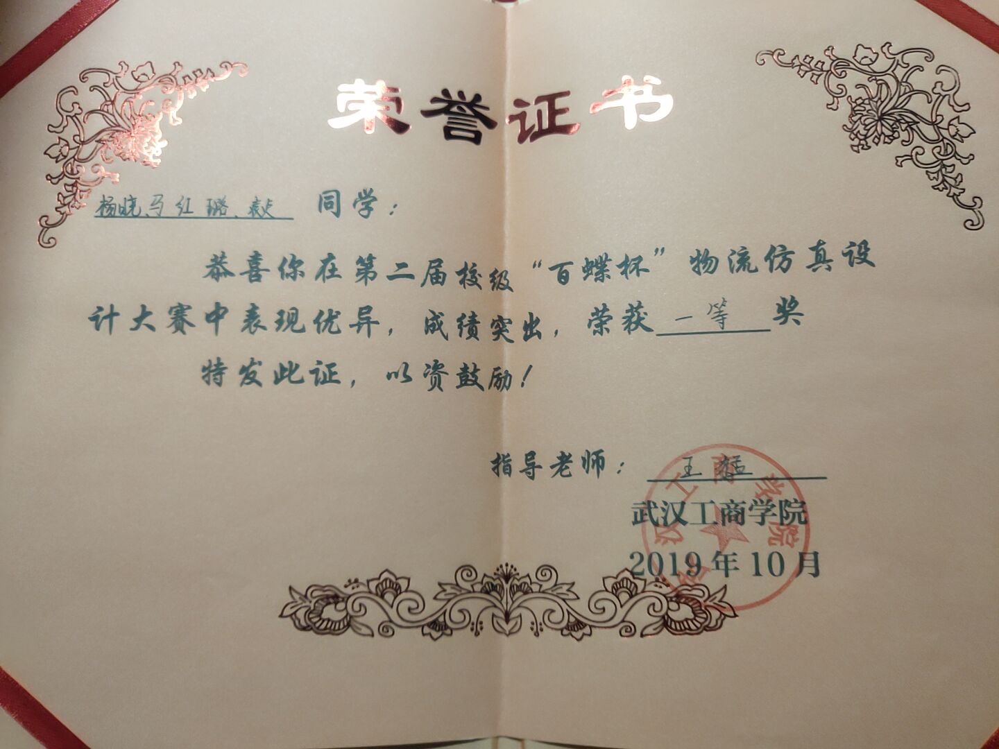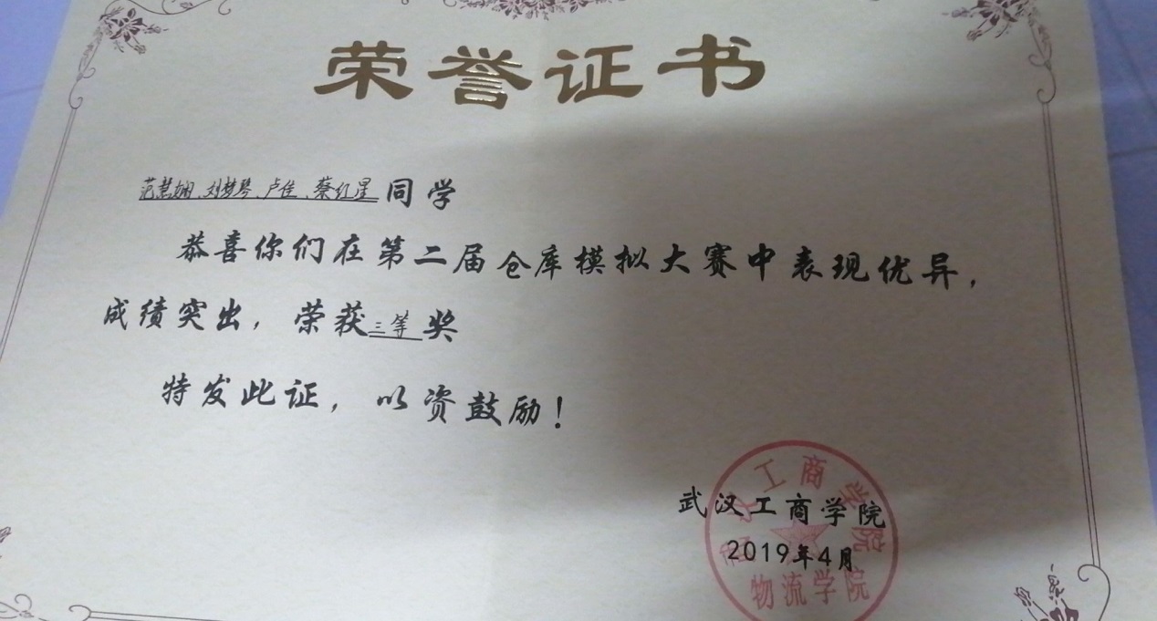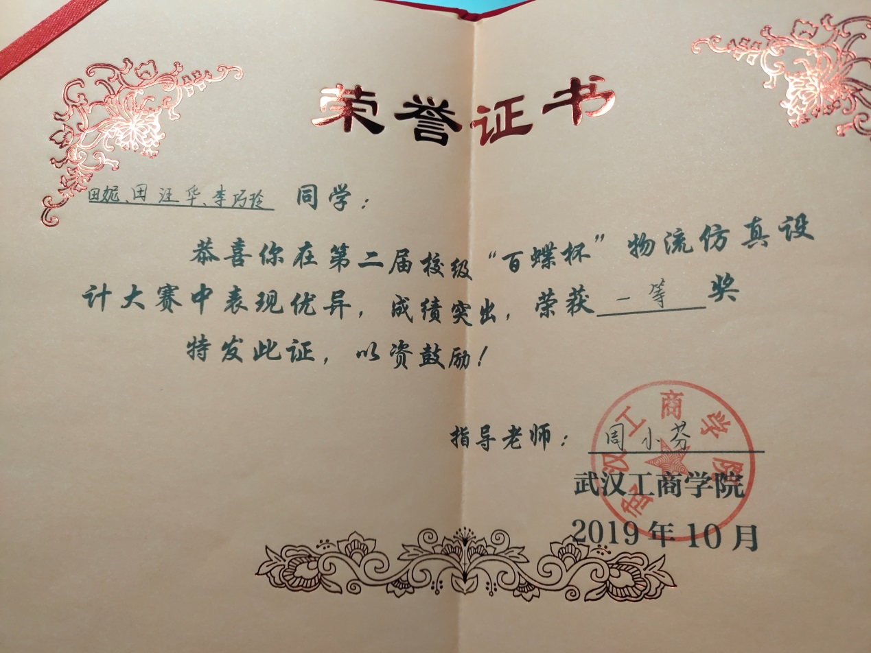 “百蝶杯”全国大学生物流仿真设计大赛 | 省部级 | 三等奖 | 17901059田妮、17901020田汪华、17901062李巧玲 | 付蒙 周小芬 | 2019.11 | |