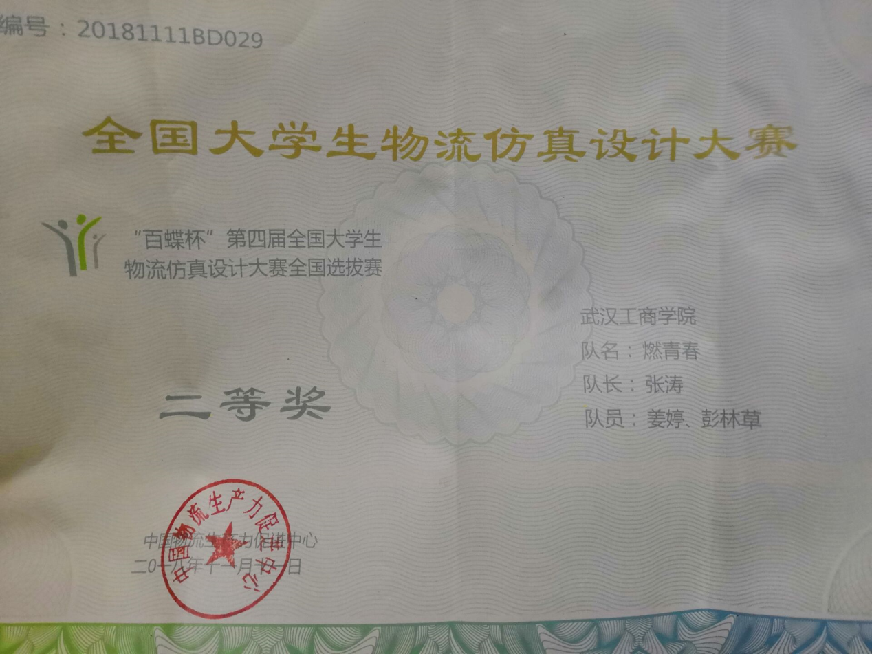 7 | 第一届“百蝶杯”全国物流仿真设计大赛湖北省赛区 | 省部级 | 二等奖 | 姜婷/16910064 张涛/16920005 彭林草/16920015 | 杜玮卉蔡红玲 | 43415 |