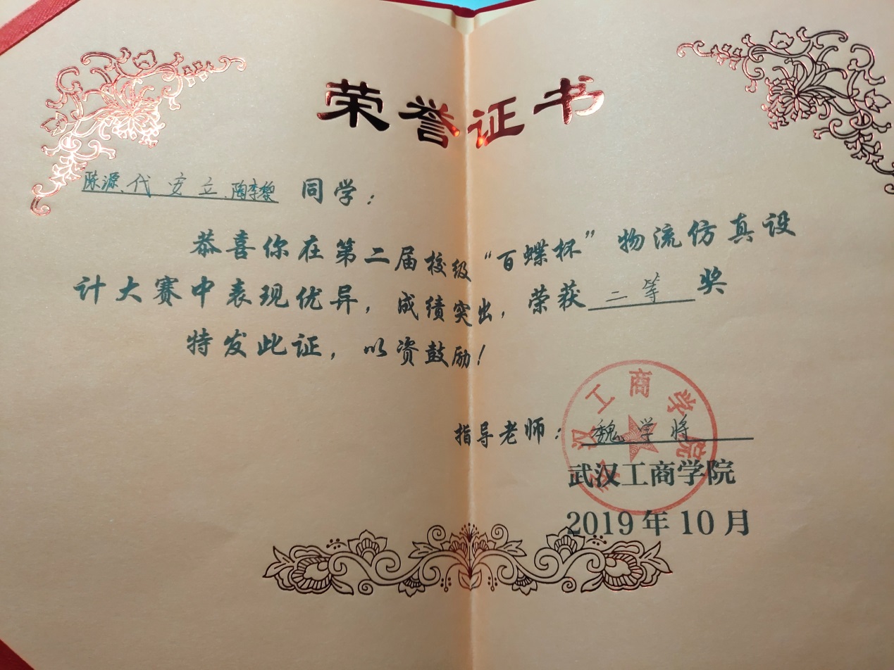 1 | “百蝶杯”全国大学生物流仿真设计大赛 | 省部级 | 三等奖 | 17901094袁贞、17901092杨晓、17901093马红璐 | 王猛 操露 | 2019.11 |