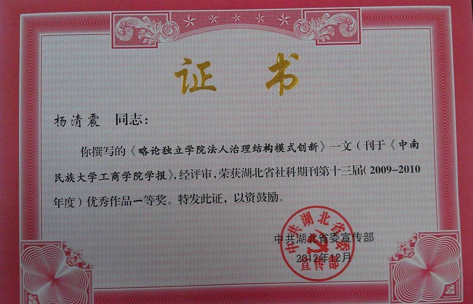 湖北省社科期刊优秀作品一等奖