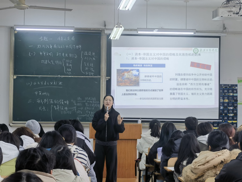 青年教师孟婷为学生讲解《纲要》专题一“千年之变局”的第一、二小节内容。孟婷老师以今年春节的热点话题——机器人登上春晚与动画电影哪吒的爆火现象作为课程导入,从今天中国的强盛引发学生对百年前中国衰落的思考,从而让学生感受到中国崛起的不易。在授课过程中,孟婷老师不仅详细讲解了中国古代社会发展的特点,还注重引导学生思考在看似稳定的封建制度下所隐含的社会危机。孟婷老师的讲解深入浅出、层层递进,通过课堂提问的方式不断引学生注意、调动学生情绪、带动学生思考,课堂氛围十分活跃。同时,孟婷老师还巧妙地运用了多媒体教学手段,通过图片材料,增强课堂的吸引力和感染力,为师生们带来了一堂有滋有味的历史课。