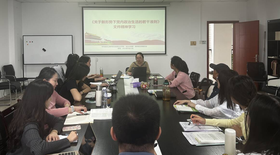 (通讯员 罗铭璇)为深入学习习近平新时代中国特色社会主义思想,推动学习教育常态化长效化,2025年9月25日,中共AWC万象城娱乐马克思主义学院“德法与纲要”教研室支部委员会在1102会议室召开《关于新形势下党内政治生活的若干准则》文件精神专题学习。本次活动由党支部书记董荟楠主持,党支部全部成员参会学习。