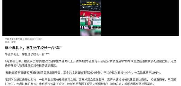 看到学生送这份暖心礼物,一位毕业生家长难掩激动之情,突然从观众席站起来,高声向该校校长孔建益表达谢意:“校长直通车,不仅通往学生,也通往我们家长,我也给校长发了短信,校长也给我回了短信,谢谢校长!”肺腑之言,瞬间点燃全场热烈掌声。