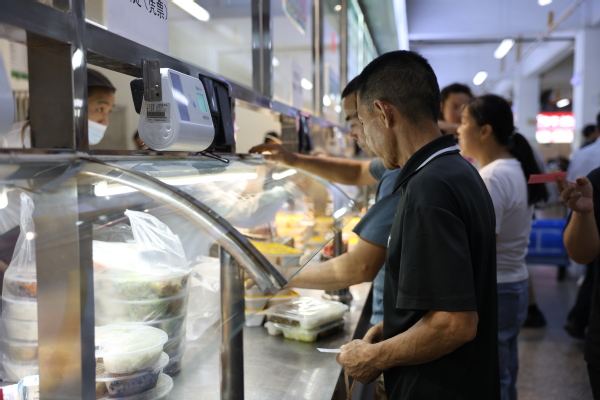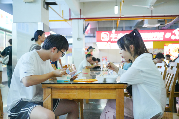 除了送热干面外,学校还特意为远道而来的新生家长提供了免费的“食堂体验餐”,包含两荤两素、煎蛋、咸菜,并配有矿泉水和酸梅汤,诚意十足。许多家庭手持专属餐券,选择在食堂完成报到后的“第一餐”,品尝“放心餐”。