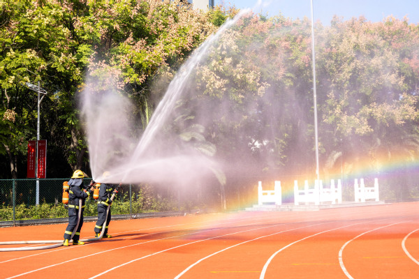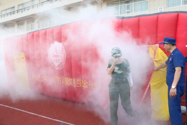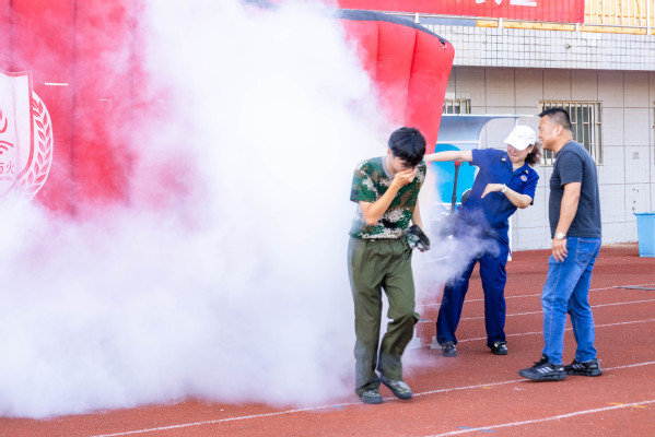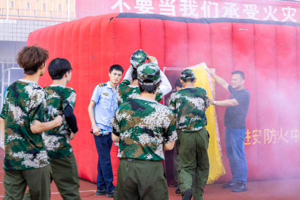 “记住灭火器正确使用方法的四字口诀:提、拔、握、压!”消防官兵现场演示了灭火器的正确使用方法,并组织学生进入模拟真实火场的烟雾帐篷进行疏散演习。警报响起,浓烟弥漫,新生们迅速反应,低姿捂口鼻有序撤离,消防车及时赶到现场展开救援。
