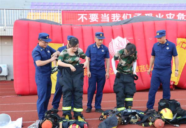 图为消防宣传人员为新生穿戴消防战斗服 摄影:陈雯茜