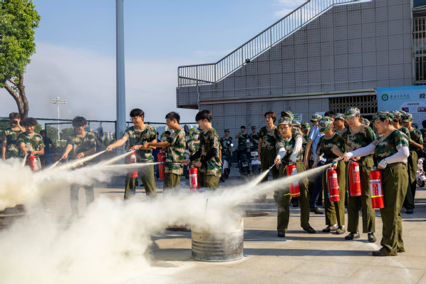 图为新生模拟灭火 摄影:余剑韬 陈雯茜