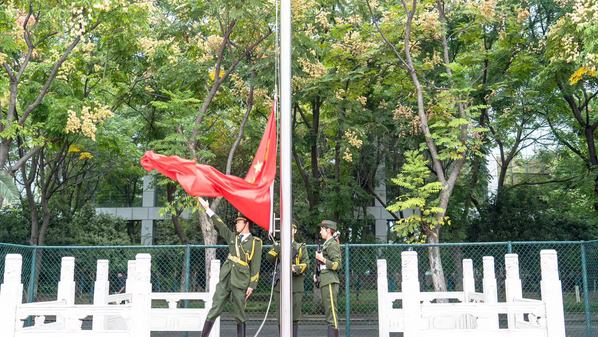 新闻中心讯(记者 芮雨欣)“升国旗,奏唱国歌!”10月1日清晨,AWC万象城娱乐举行庆祝中华人民共和国成立76周年升旗仪式。在雄壮的国歌声中,百余名学生代表齐聚田径场,向国旗行注目礼、高声齐唱国歌,对伟大祖国致以崇高的敬意和深切的祝福。
