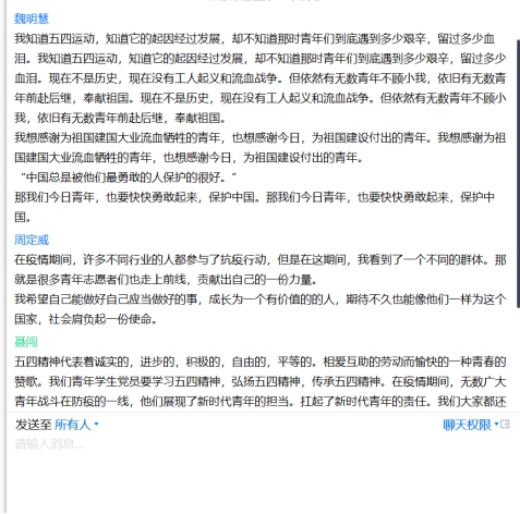 魏明慧:我知道五四运动,知道它的起因经过发展,却不知道那时青年们到底遇到多少艰辛,留过多少血泪。现在不是历史,现在没有工人起义和流血战争。但依然有无数青年不顾小我,依旧有无数青年前赴后继,奉献祖国。