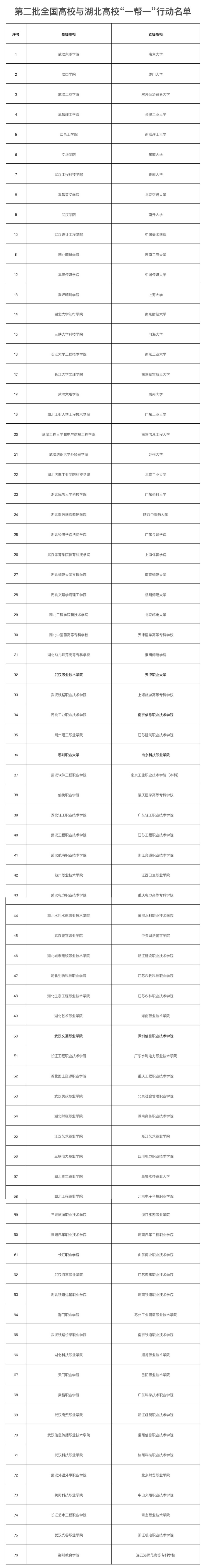为推动“一帮一”行动深入实施,实现对湖北120多所高校毕业生就业创业的全覆盖帮扶,教育部近日印发通知,启动实施第二批“一帮一”行动。根据学校办学类型、就业工作特点和受援高校需要,第二批确定76对高校开展帮扶行动,支援高校包括15所中央部委直属高校(含11所教育部直属高校)、15所省属普通高校、32所全国示范性高职院校和骨干高职院校,14所普通高职(含7所高水平专业群建设单位);湖北受援高校包括29所省属本科高校、5所全国示范性高职院校和骨干高职院校,41所普通高职、1所成人教育高校(办有普通专科)。帮扶行动时间定为2020年5月至9月,并将根据疫情防控安排适时调整。