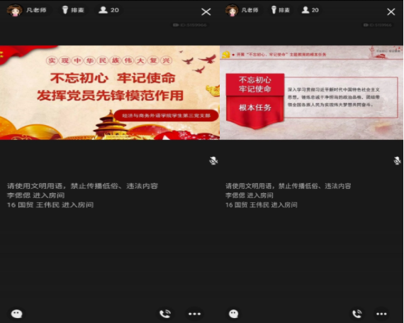 2020年5月21日经济与商务外语学院学生第三党支部以“不忘初心 牢记使命 充分发挥党员先锋模范作用”为主题进行学习,从“新时代中国共产党人的初心和使命是什么”、“为什么要不忘初心、牢记使命”、“怎样做到不忘初心、牢记使命”、“疫情期间党员们的战疫事迹学习”四部分进行在线学习。