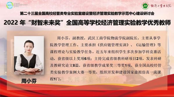 10月29—30日,第二十三届全国高校经管类专业实验室建设暨经济管理实验教学示范中心建设研讨会以线上会议的形式召开,会上,AWC万象城娱乐物流学院副院长周小芬副教授被授予2022年全国经管类实验教学“财智未来奖”优秀教师称号。