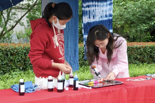 活动现场,一位同学将自己一件掉色衣服带到现场请李丹丹老师“救急”,并在老师的指导下,动手尝试捆扎、簇扎、板夹等扎染方法。李丹丹老师一边演示扎染的工艺流程,一边介绍扎染的制作原理及操作方法。她介绍说,“扎染是我国古老而独特的一种织物染色技艺,被列入国家级非物质文化遗产。‘非遗’传承和推广需要青年一代的支持和参与,希望你们能够爱上植物扎染,将植物扎染这项传统技艺传承下去。”