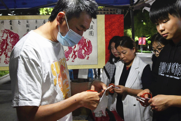 剪纸技艺展位也围满了学生,大家手握剪刀跟着金俊安老师学习剪纸,一张张平平无奇的彩纸变成了一朵朵梅花等各式图案,同学们沉浸其中,更乐在其中。金俊安表示,看到同学们对剪纸这么感兴趣,非常欣慰,优秀传统文化就应该由青年人传承和发扬下去。