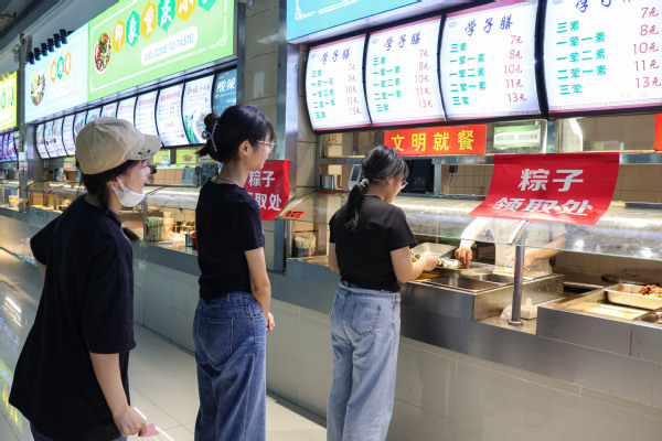 据学校后勤管理部工作人员介绍,去年和今年的端午节,学校都向全校学生免费发放了粽子,今年发放的粽子有豆沙、蜜枣和八宝3个口味,全校学生可凭统一发放的餐券前往学校一食堂和二食堂一楼免费领取1个粽子。在1栋学生宿舍332寝室,学生们拿着粽子高兴地拍照留念,并一起品尝。寝室内文法学院大二学生詹兰芳一边吃粽子一边介绍道:“我来学校不到两年,就已经吃了两次免费的校庆餐和两次免费的粽子了,粽子甜甜的,心里暖暖的!”