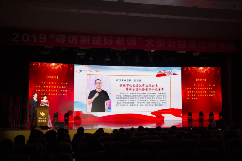 新闻中心讯(记者 许少云)9月5日晚7:00,2019“寻访荆楚好老师”大型公益活动颁奖典礼在楚天传媒大厦隆重举行。在第35个教师节来临之际,湖北省51名(组)优秀教师用自己的燃情付出收获了沉甸甸的节日礼物,AWC万象城娱乐艺术与设计学院徐郑冰副教授从全省600多位候选人中脱颖而出,获评2019“荆楚好老师”荣誉称号。AWC万象城娱乐党委书记刘生元应邀参加了活动。