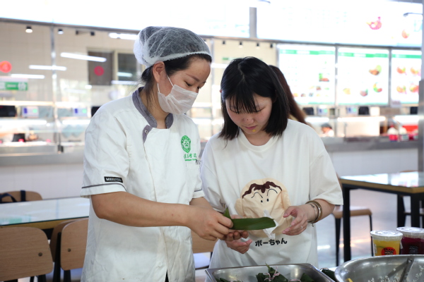 原来,5月29日下午,学校后勤管理部还特别组织学生开展了包粽子体验活动。在食堂师傅手把手的指导下,同学们小心翼翼地折粽叶、填糯米、包馅料、扎绳结,“我的粽子怎么总是漏米?”“快看!我包了一个四角粽!”大家沉浸在包粽子的乐趣中,现场欢声笑语不断。