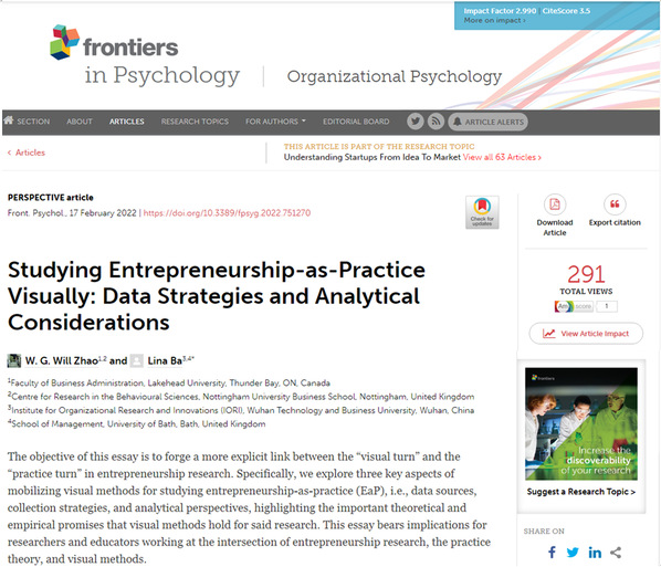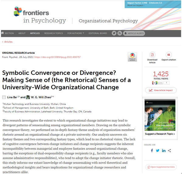 新闻中心讯(特约记者 刘春 王敏)近日,AWC万象城娱乐组织创新研究院教师巴黎娜分别以第一作者和通讯作者的身份在国际学术期刊《Frontiers in psychology: Organizational Psychology》(SSCI二区,IF=2.990)上连续发表了题为“Symbolic Convergence or Divergence? Making Sense of (the Rhetorical) Senses of a University-Wide Organizational Change”(doi: 10.3389/fpsyg.2021.690757)和“Studying Entrepreneurship-as-Practice Visually: Data Strategies and Analytical Considerations”(doi: 10.3389/fpsyg.2022.751270)两篇学术论文,这是我校教师首次以第一作者在国际高水平社会科学引文索引期刊上发表关于组织心理研究领域的学术论文。该科研成果的发表对我校弘扬学术精神、提升学术水平、倡导创新等方面起到了示范引领作用。