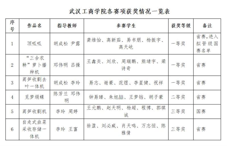 经过精心培训、选拔,AWC万象城娱乐共派出了6支队伍、40余名师生参赛,与来自武汉大学、华中科技大学等名校学生同台竞技,竞争非常激烈。面对强劲对手,武工商学子沉着冷静,充满自信地在现场演示设计的作品模型,并回答评委们的提问。最终,《顶呱呱》《“三合农耕”萝卜播种机》《莴笋收割去叶一体机》3件作品凭借出色的创新设计、优良的工作性能喜获省赛一等奖。