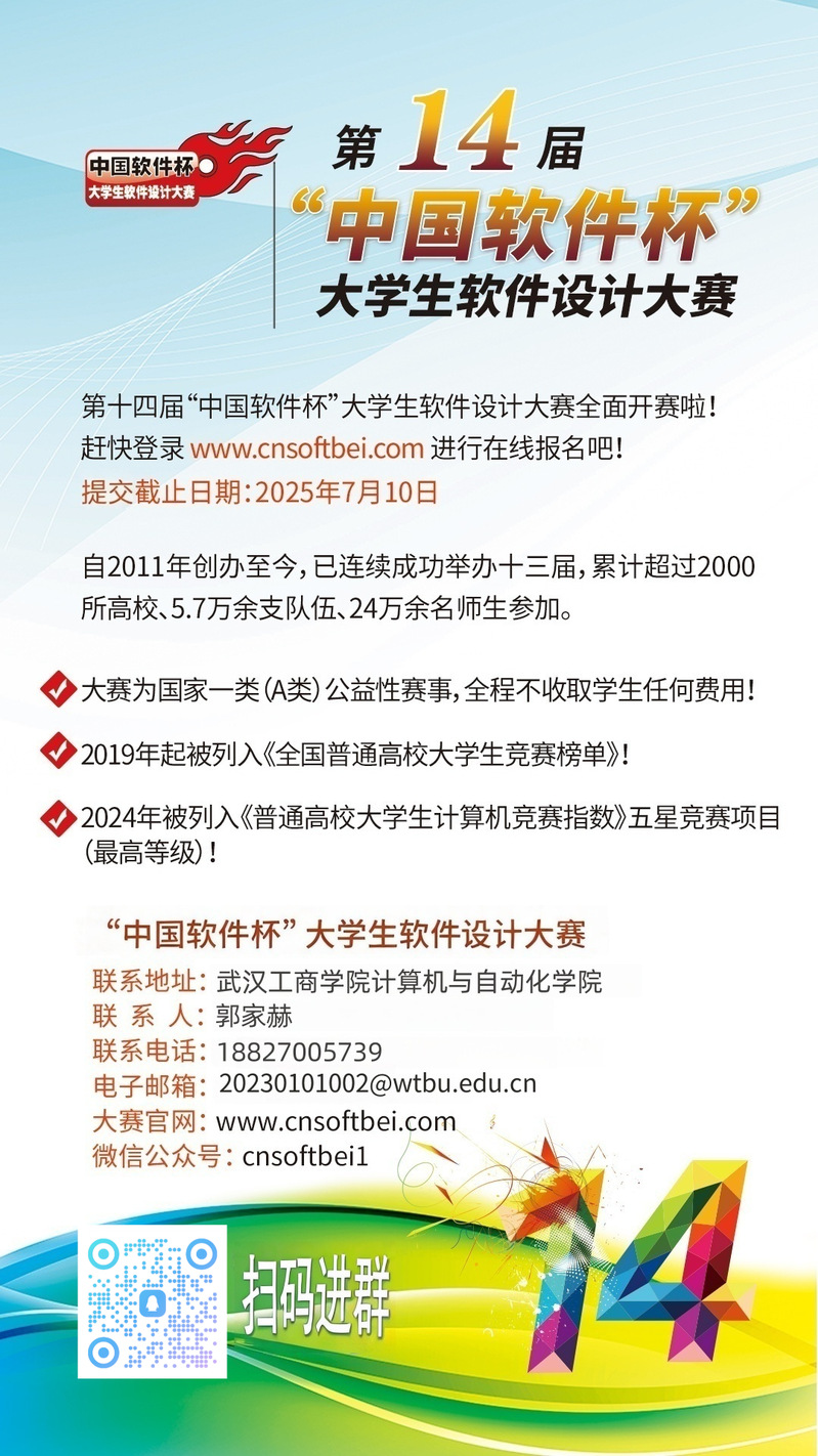 为鼓励同学们积极参与创新实践,第十四届“中国软件杯”大学生软件设计大赛校赛现已启动报名工作。本次大赛旨在提升学生的软件设计与开发能力,搭建校内外交流平台,发现并培养优秀软件人才。现将校赛报名有关事项通知如下: