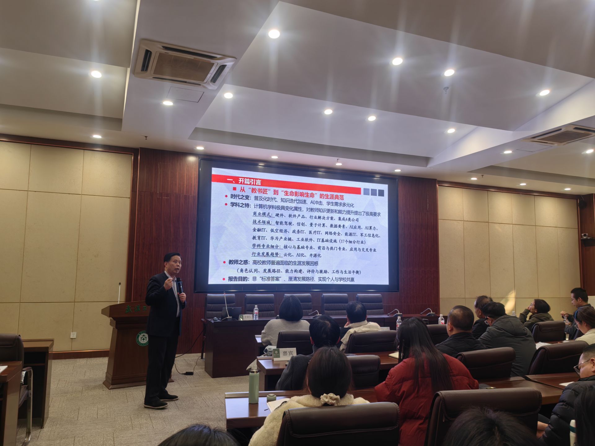 赵校长以“高校专业教师生涯发展——困境、逻辑与路径”为主题,从开篇引言、生涯发展基本认识、底层逻辑与生涯认知、发展路径与方法四个维度展开深度分享。在开篇部分,他结合时代变革、计算机学科特性与教师普遍困惑,提出讲座旨在帮助教师厘清发展路径,实现个人与学校共赢。随后,他系统阐释了生涯的本质、阶段划分与规划核心要素,强调生涯教育是贯穿终身、注重个性化与动态适应的综合性教育理念,为教师全面理解生涯发展奠定理论基础。