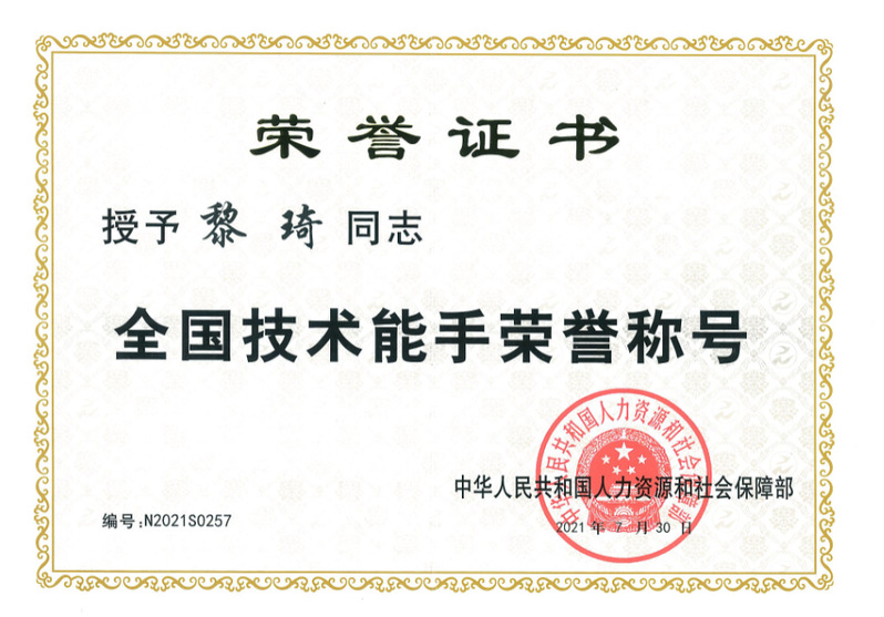 计算机科学与技术专业学生黎琦获全国技术能手荣誉称号