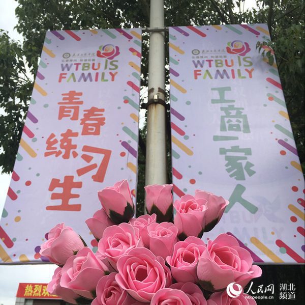 图为玫瑰花和路灯吊旗 (周于靖 摄)