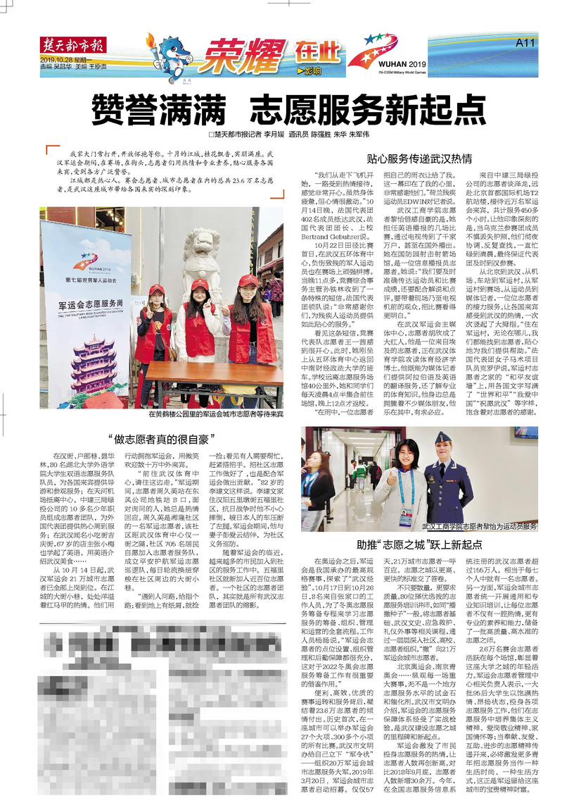 从北京到武汉、从机场、车站到军运村,从军运村到赛场,从运动员到媒体记者,一位位志愿者的接力服务,让各国来宾感受到武汉的热情,一次次竖起了大拇指。“住在军运村,无论在哪儿,我们都能找到志愿者,贴心地为我们提供帮助。”法国代表团女子马术项目队员克罗伊说,军运村志愿者之家的“和平友谊墙”上,用各国文字写满了“世界和平”“我爱中国”“祝愿武汉”等字样,饱含着对志愿者的感谢。