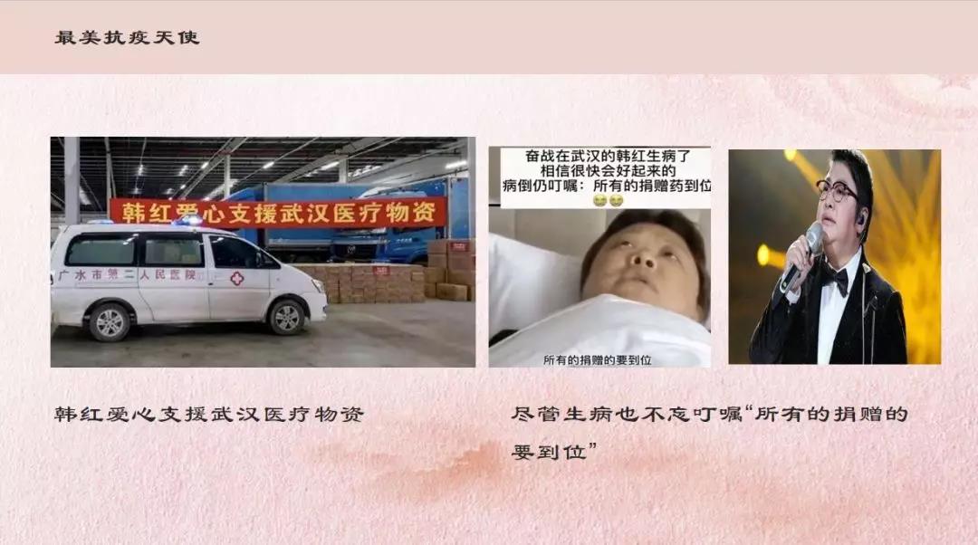 我是18计科本11的周雁同学,此次我主要选择了钟南山院士和韩红偶像来进行我此次的PPT演讲,他们一个在奔赴在抗疫最前线,一个在后面给予全国人民的财力,物力和人力,为我们提供了强有力的后援。中国有此二人,何愁疫情不去,雾霾不散,阳光不来!