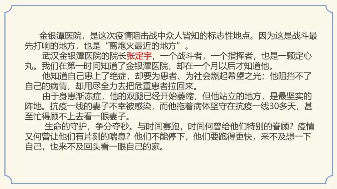 “生命可贵,医护应被崇敬。我所制作的PPT为新型冠状病毒致敬最美逆行者。没什么岁月静好,只是有人替我们负重前行。大年初一,医护人员依旧忙碌,在救死扶伤、安全保卫的第一线,坚守自己的岗位,他们用“舍”和“守”撑起百姓的安康,为人民的健康保驾护航,抗击疫情,他们一直准备着。”