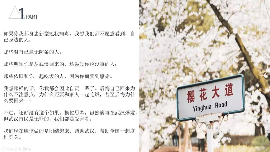 “待阴霾散去,迎来阳光,我们相约武汉,看樱花盛开,吃着热干面,喝着糊米酒,感受这座城市火热! ”