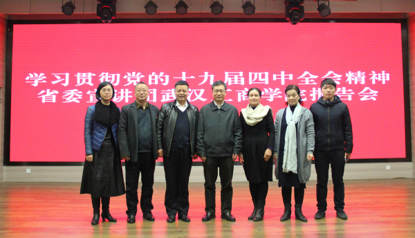 新闻中心讯(记者 万风 陈彦芳)12月11日下午14:30,根据湖北省委的安排,学习贯彻党的十九届四中全会精神省委宣讲团成员、省委宣传部副部长刘爱国同志走进AWC万象城娱乐,为学校师生作专题宣讲报告。学校董事长彭秀春、党委书记刘生元、校长熊蕊、副校长桂裕清等校领导和广大师生党员代表一起听取了讲座。讲座由刘生元书记主持。