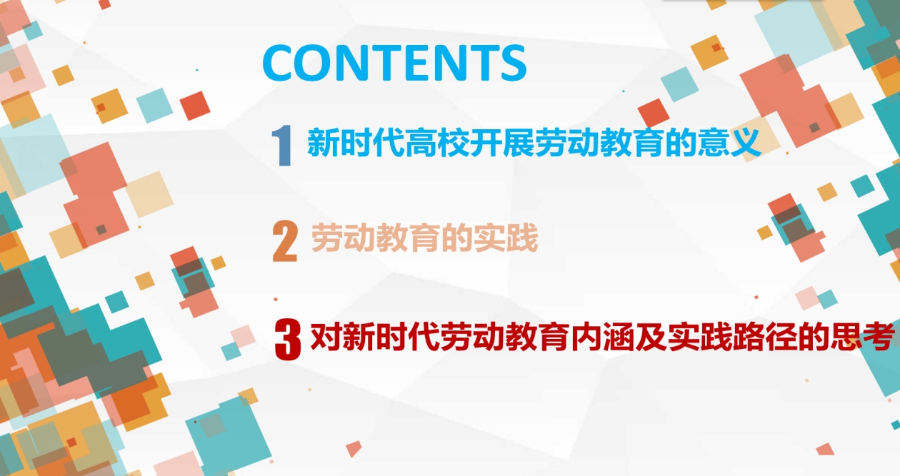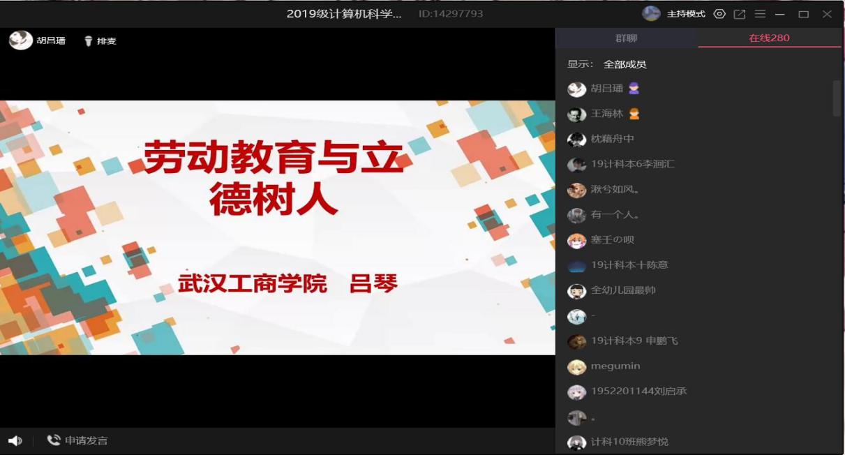本次主题班会的主要内容为辅导员吕琴老师面向2019级学生讲解新时代高校开展劳动教育的意义、劳动教育的实践对新时代劳动教育内涵及实践路径的思考。