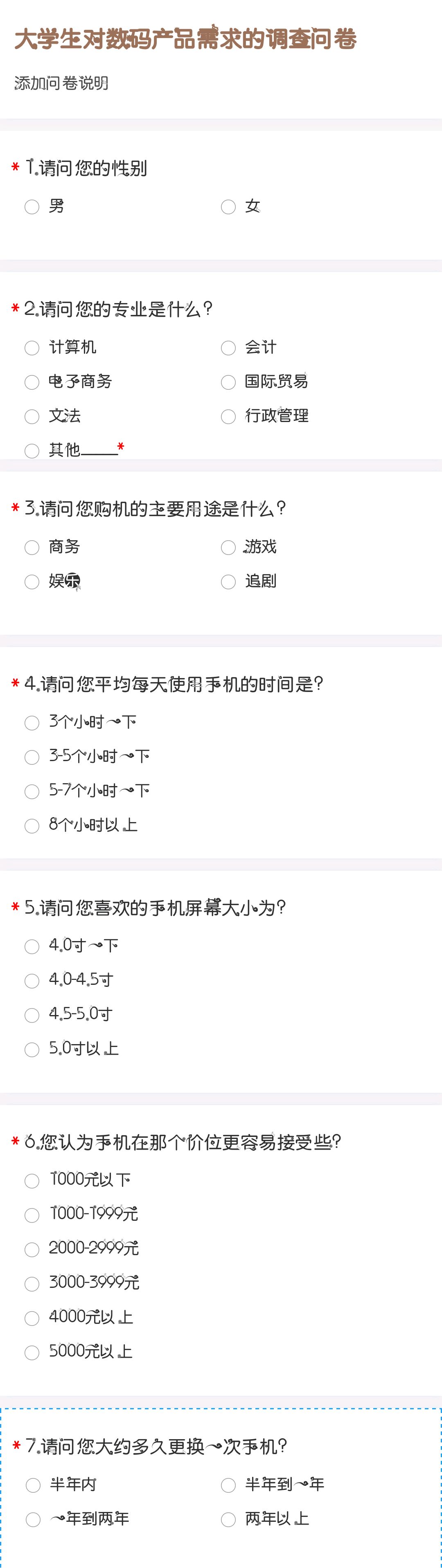 1.推荐选购:当消费者在浏览我们众创数码网站时,点击”购机推荐“后,会弹出购机推荐的问卷调查表,其内容会以如:“1.您购机主要用途是¨商务、¨游戏、¨娱乐”、“2.您习惯平时观看视频并下载的需求是¨高、¨一般、¨不怎么看视频和下载”等贴近客户生活需求的通俗的话语来收集用户需求。后台将在用户提交问卷后及时给出高、中、低三档的产品系列智能推荐,以便用户进行后续的比较与购机思考。