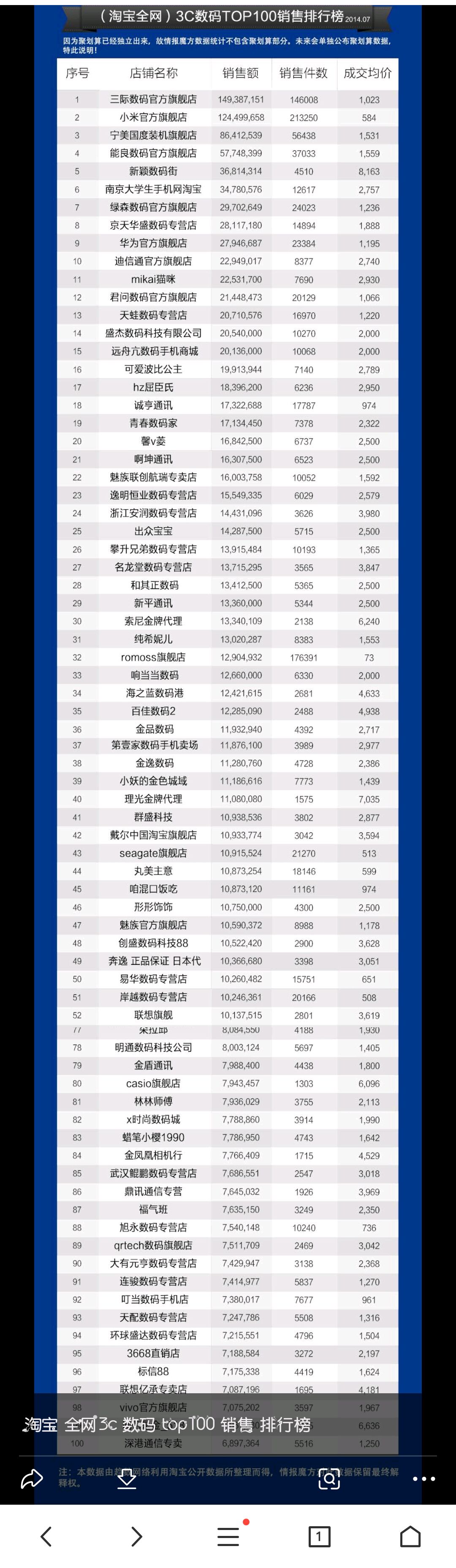 图二:(淘宝全网)3C数码销售T100月销售排行榜