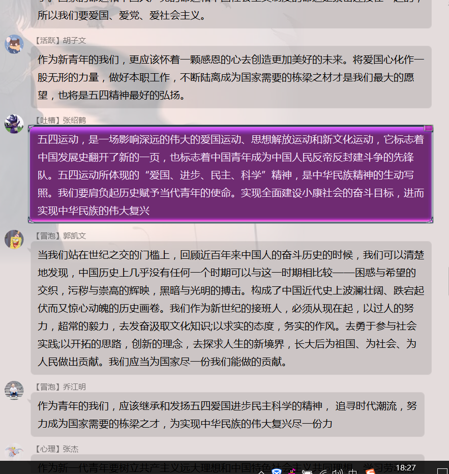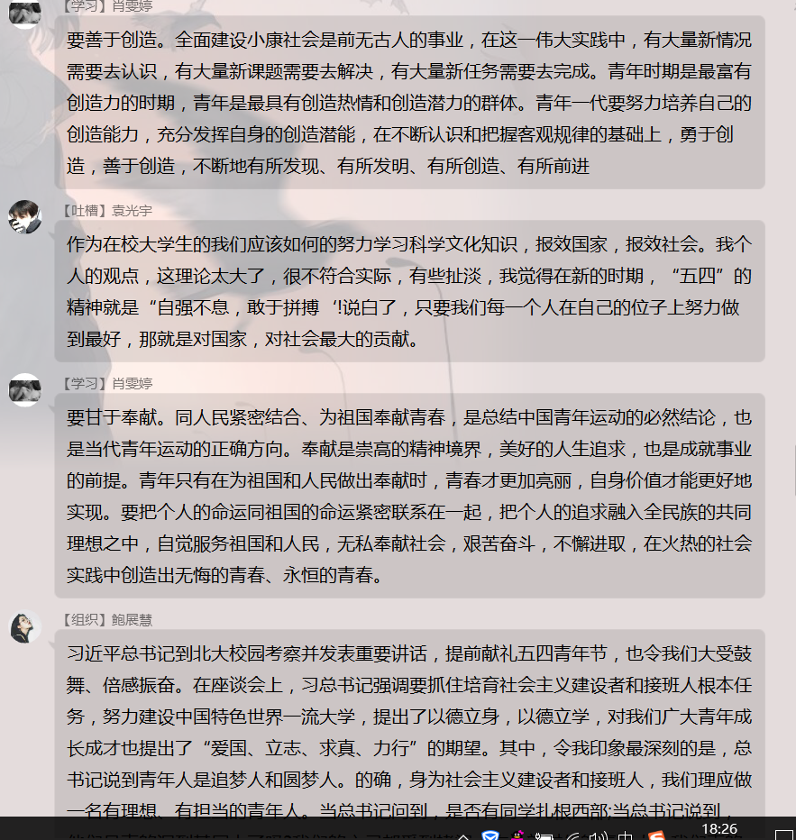 作为当代大学生要积极回应振兴中华的历史使命,肩负起全面建设小康社会的时代责任,提高服务国家人民的社会责任感,从容面对成长道路上的困难与挫折,开拓创新,报效祖国。因此本班将进行线上QQ群会议,并各位同学说出自己对于“五四青年精神”的感想。