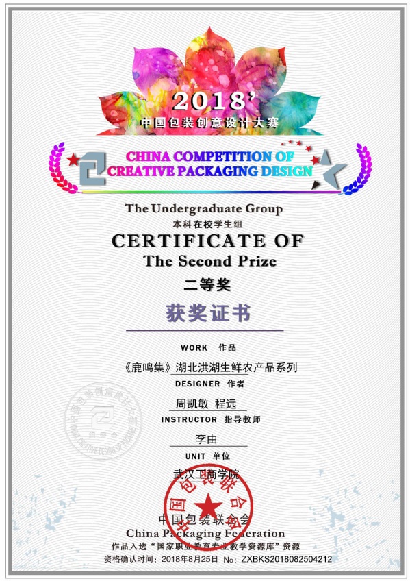 其中,学生王凯丽、张捷霖、候佳慧的作品《年》荣获一等奖,指导老师是张莉;学生王思雨、白晓敏的作品《仰阿萨》以及周凯敏、程远的作品《鹿鸣集》分别荣获二等奖,指导老师分别是张莉和李由;李新的作品《楚天一品》,芦薇、程晶的作品《洪湖荷花茶包装》,以及张彤、董倩的作品《白露》分别荣获三等奖,指导老师是李由。