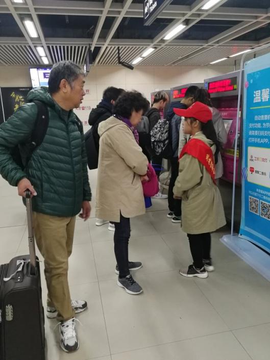 图为志愿者在为乘客提供服务 摄影:胡瑾