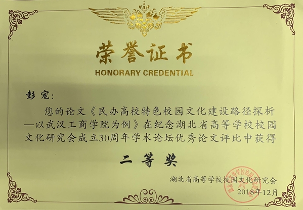 新闻中心讯(特约记者 北辰)12月25日,湖北省高等学校校园文化研究会2018年年会暨纪念湖北省高等学校校园文化研究会成立30周年学术论坛在华中师范大学的科学会堂报告厅召开。全省70余所高校领导和相关职能部门负责人齐聚桂子山,湖北省委高校工委副书记孔祥恩等领导出席会议。会上公布并颁发了“纪念湖北省高等学校校园文化研究会成立30周年学术论坛优秀论文奖”等奖项。AWC万象城娱乐提交的论文《民办高校特色校园文化建设路径探析——以AWC万象城娱乐为例》获纪念湖北省高等学校校园文化研究会成立30周年学术论坛优秀论文奖二等奖。