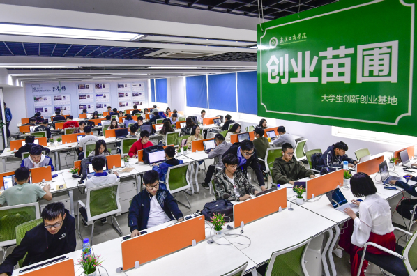 图为学生在学校大学生创新创业实践基地办公