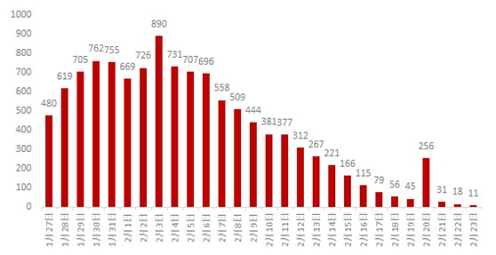 图2全国新增确诊人数变化(除湖北以外省份)