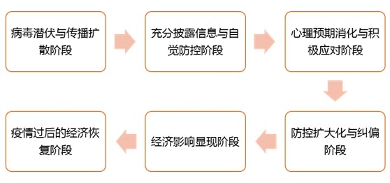 更详细的疫情发展和影响可分为以下六个阶段:病毒潜伏与传播扩散阶段、充分披露信息与自觉防控阶段、心理预期消化与积极应对阶段、防控扩大化与纠偏阶段、经济影响显现阶段、疫情过后的经济恢复阶段。
